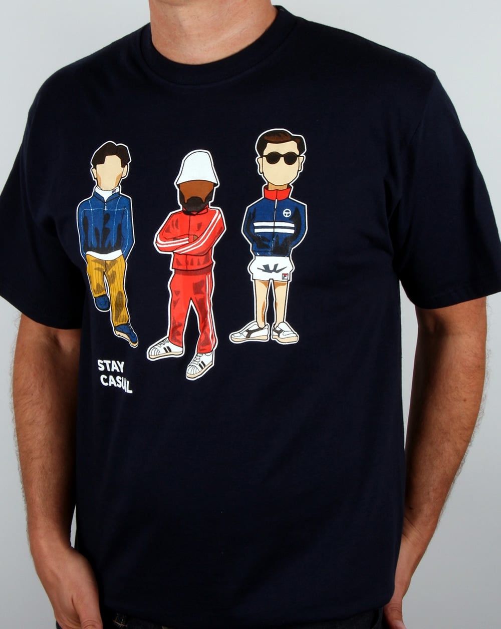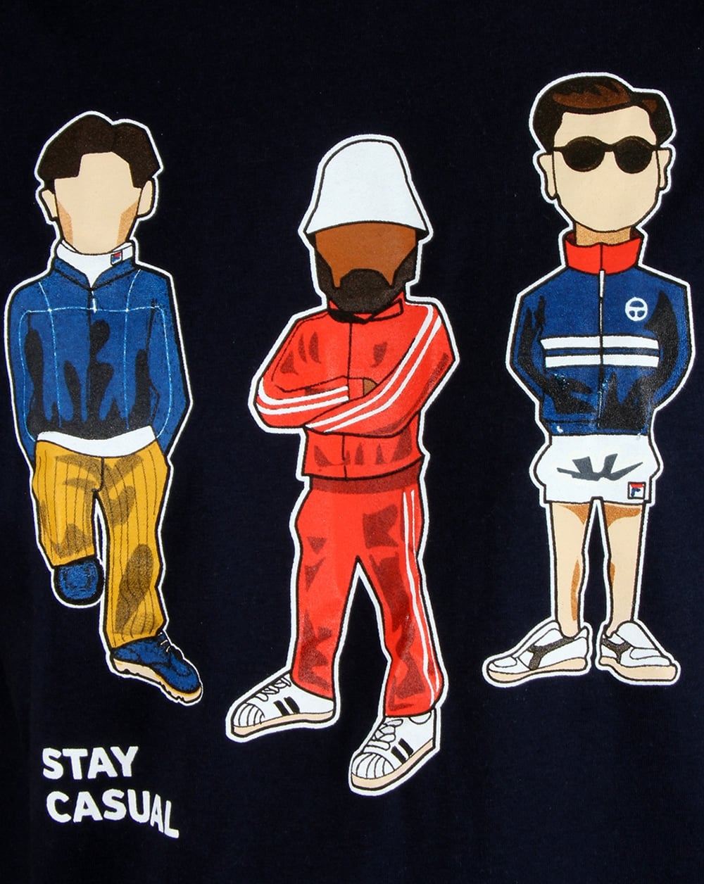 Minty hat sich mit 80s Casual Classics zusammengetan, um den neuen Style „STAY CASUAL“ zu kreieren. Mintys charakteristische handgezeichnete Karikaturen zeigen in lässiger Kleidung einige unserer beliebtesten 80er-Jahre-Marken wie Fila und Sergio Tacchini auf einem himmelblauen T-Shirt. Unser 80s Casual Classics-Logo ziert den Ärmel in kontrastierendem Weiß, das sich hervorragend mit dem Marineblau abhebt. Einige der Outfits gehören zu den Must-haves für jeden 80er-Jahre-Retro-Liebhaber, und viele Artikel sind in verschiedenen Größen auf unserer Website erhältlich.