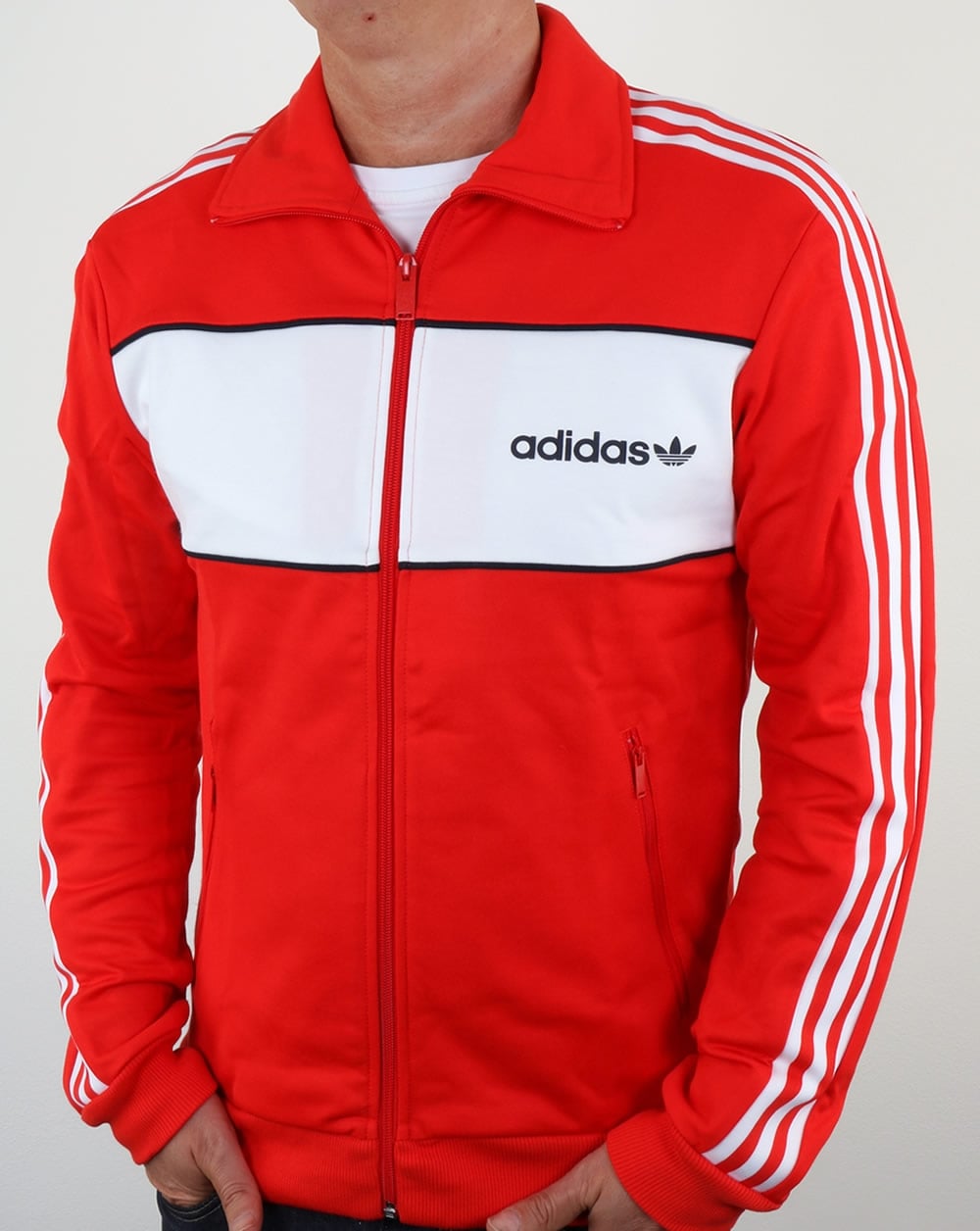 Ein frisch aussehendes adidas Trainingsoberteil mit einem kräftigen Blockfarbendesign auf der Brust. Das adidas-Logo und das Dreiblatt befinden sich auf der Brust, eingebettet in ein weiß umrandetes Kästchen und marineblaue Paspeln. Diese bilden einen schönen Kontrast zum roten Grundton des Oberteils und sorgen für einen echten Hingucker. Die wichtigen 3-Streifen-Details verlaufen in frischem Weiß über den Ärmel und runden den Gesamteindruck dieser adidas Trainingsjacke perfekt ab.